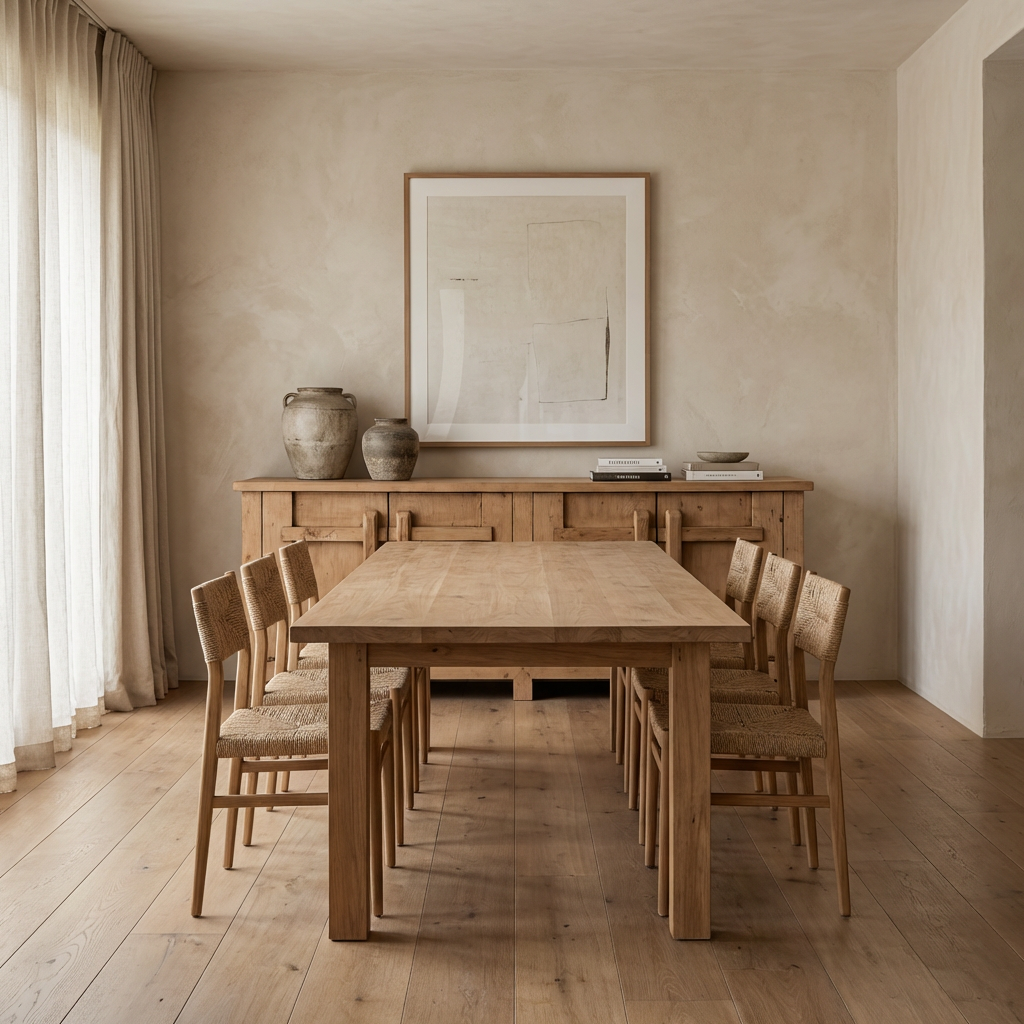 Furniture in these interiors is defined by strong, simple forms such as slab dining tables, substantial consoles and plinth-based cabinets. Minimal detailing allows the natural grain and proportion of solid elm to take focus, creating spaces that feel warm, structured and enduring.