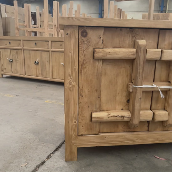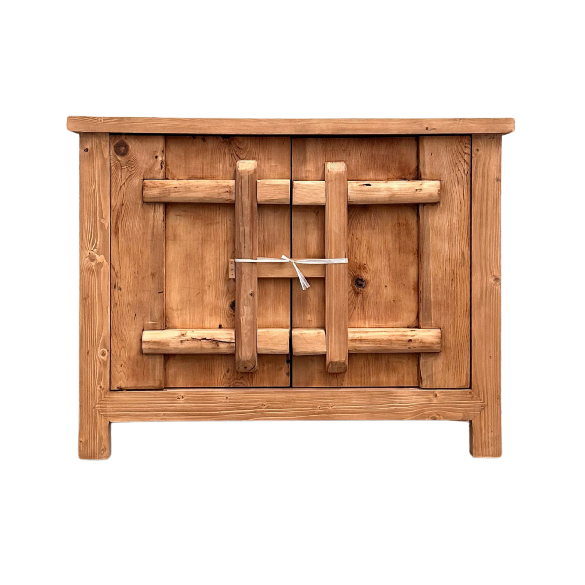 Crafted from solid timber, the Latch 2 Door Cabinet features door fronts repurposed from antique village panels, retaining timeworn grain, weathered texture and original latch detailing. The surface patina and visible markings speak to the history of the timber, giving the piece a distinctive, aged presence.