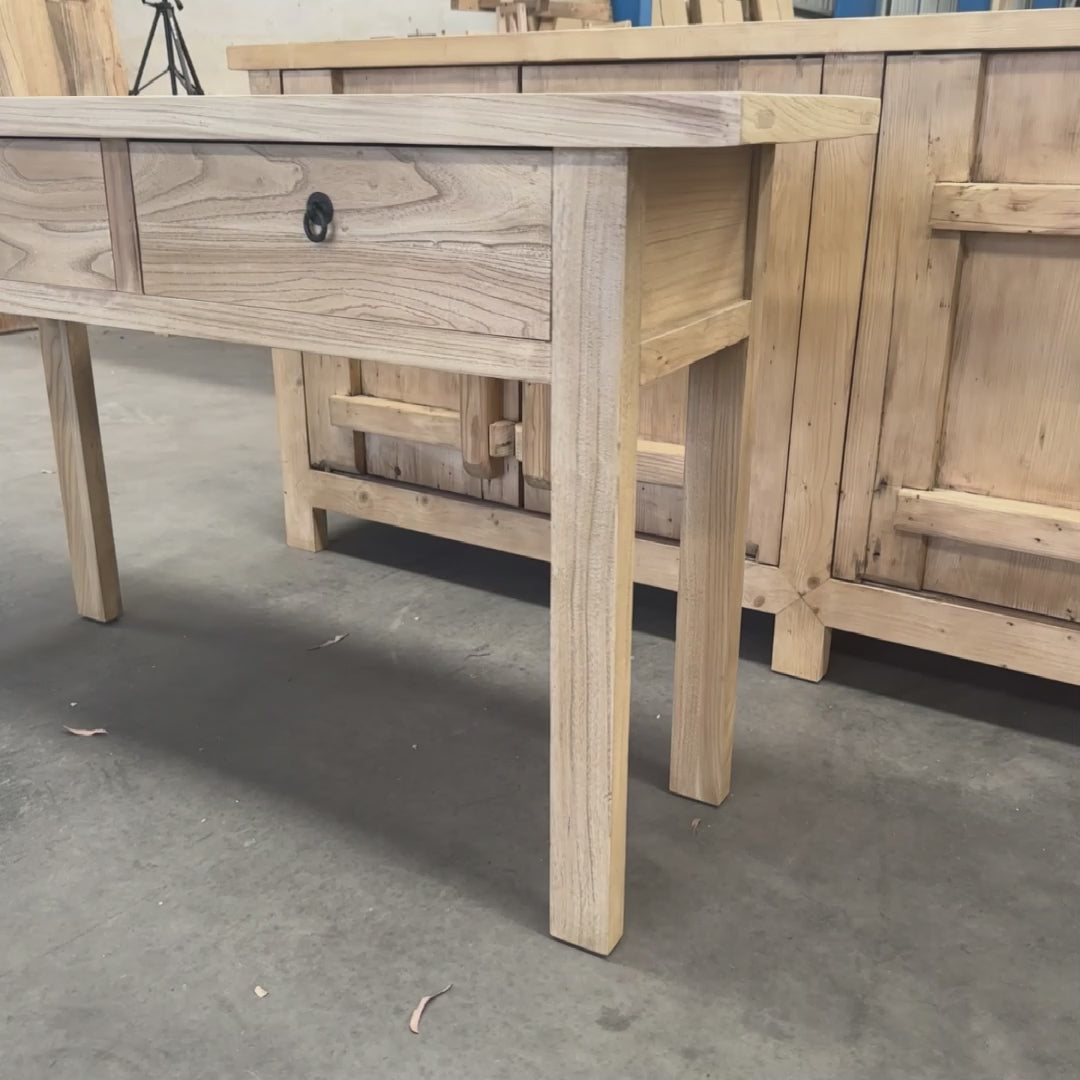 Made from natural, organic elm, each console displays unique knots, colour shifts and surface character inherent to aged timber. Two drawers provide practical storage, while the 140 cm width makes it well suited to entryways, hallways or positioned behind a sofa in interiors seeking functional timber furniture with understated presence.