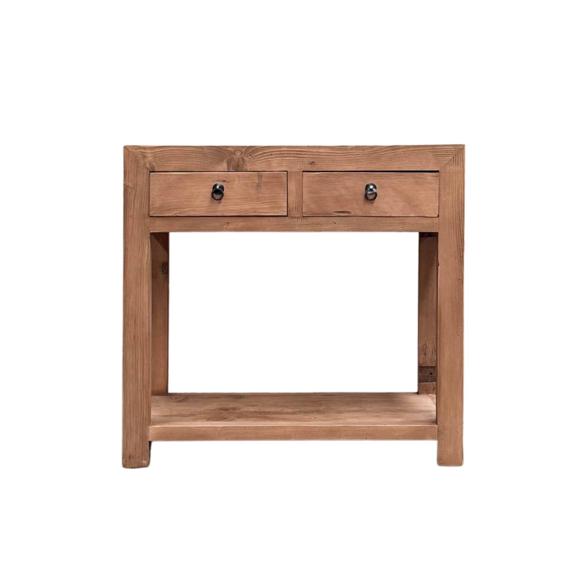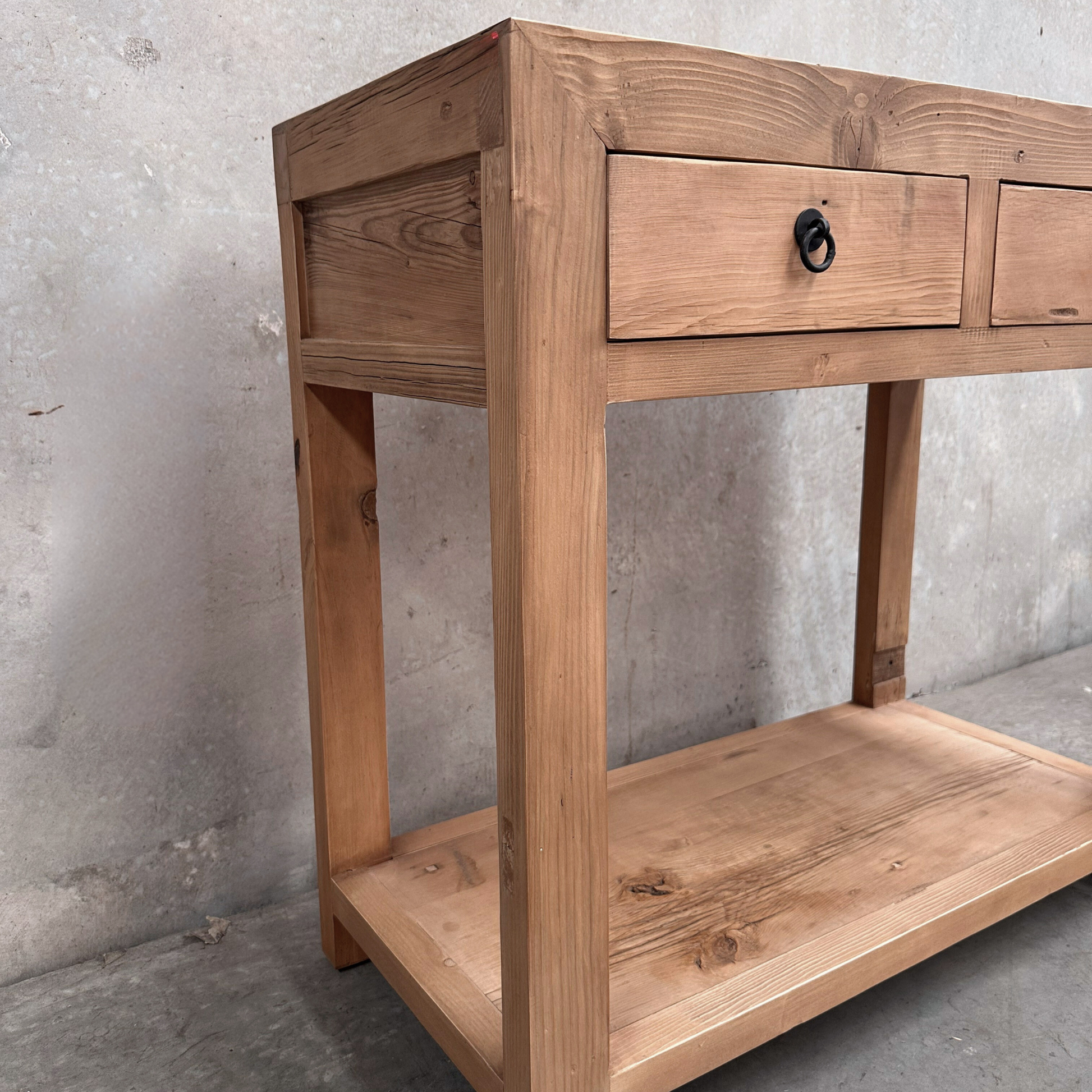 Made from natural, organic reclaimed timber, each console displays individual knots, subtle colour shifts and texture inherent to rescued timber. Two integrated drawers provide practical storage, while the open lower shelf offers additional space for baskets or display, making it well suited to narrower hallways, entryways or layered living interiors.