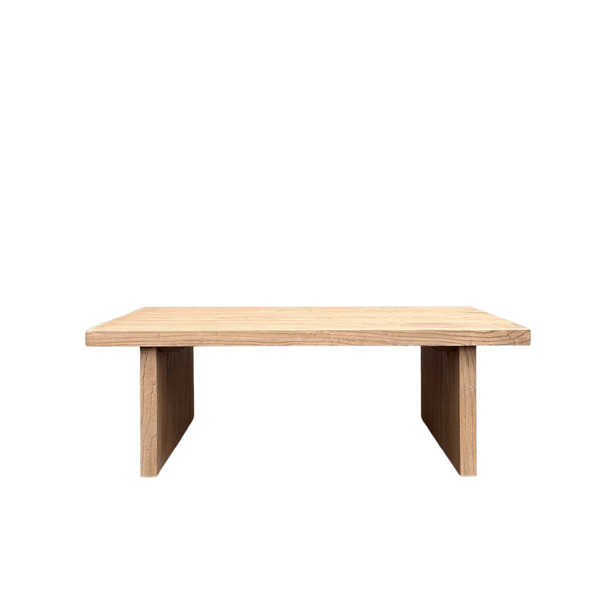 Made from natural, organic elm, each table displays unique knots, subtle colour shifts and surface variation inherent to aged timber. The generous 130 cm width and substantial proportions make it well suited to living spaces seeking a low, structured centrepiece with lasting durability.