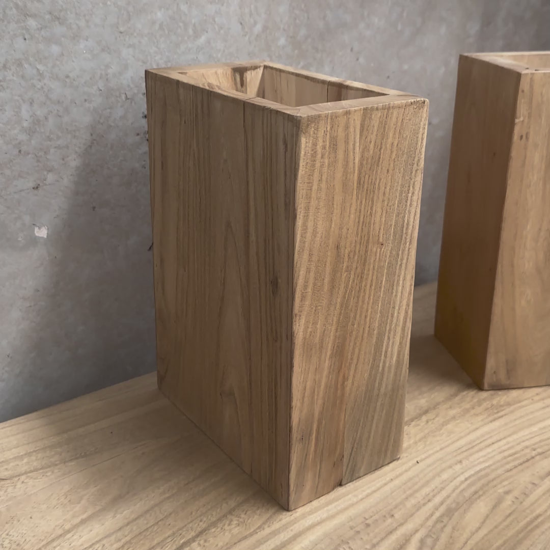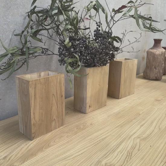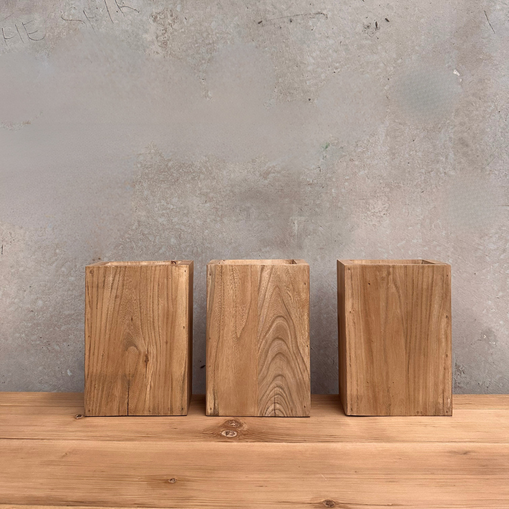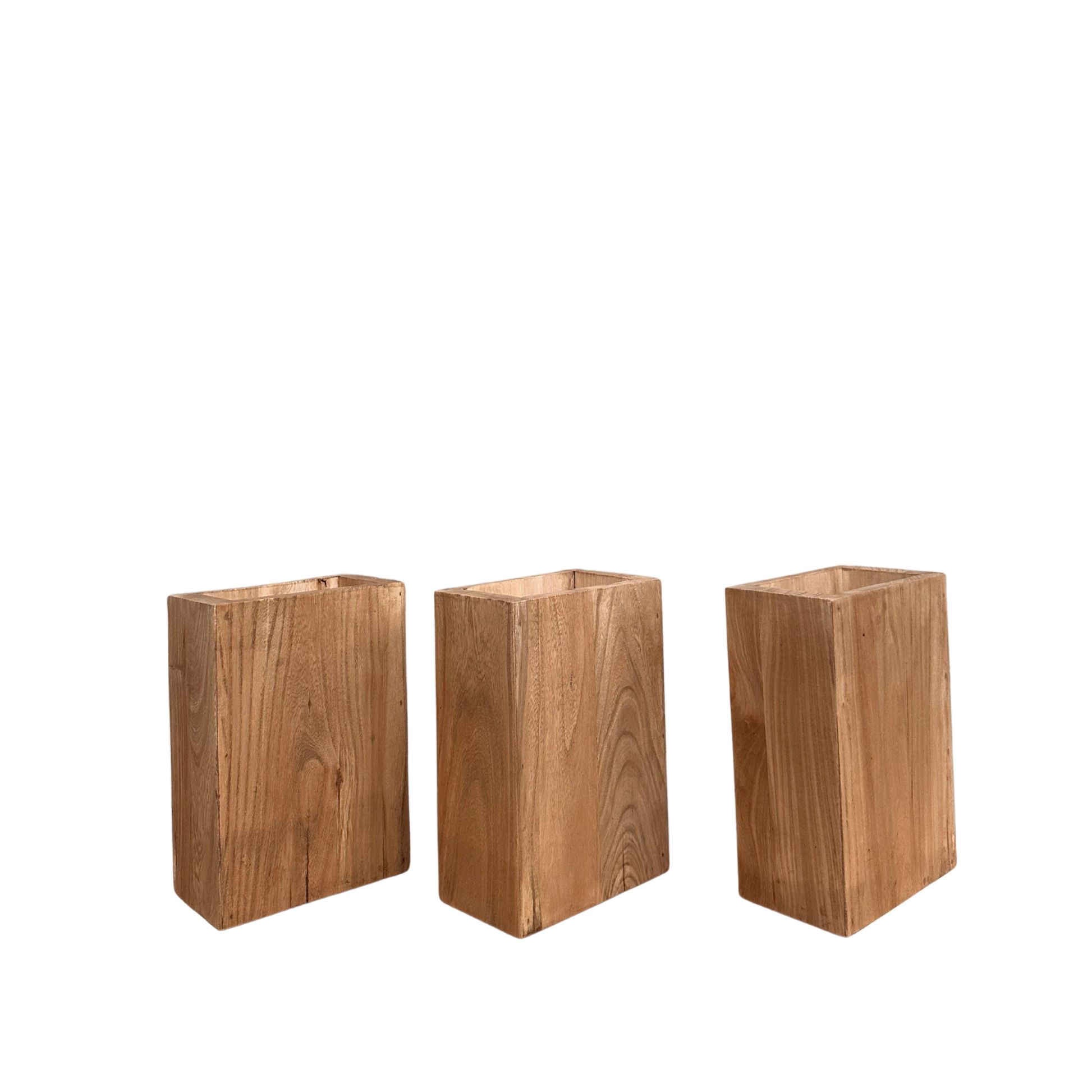 Crafted from solid elm, the Elm Box Vase is defined by its clean, rectangular form and visible grain movement. The natural tonal variation and surface character of the timber give each piece warmth and depth, allowing it to function as both vessel and sculptural object.
