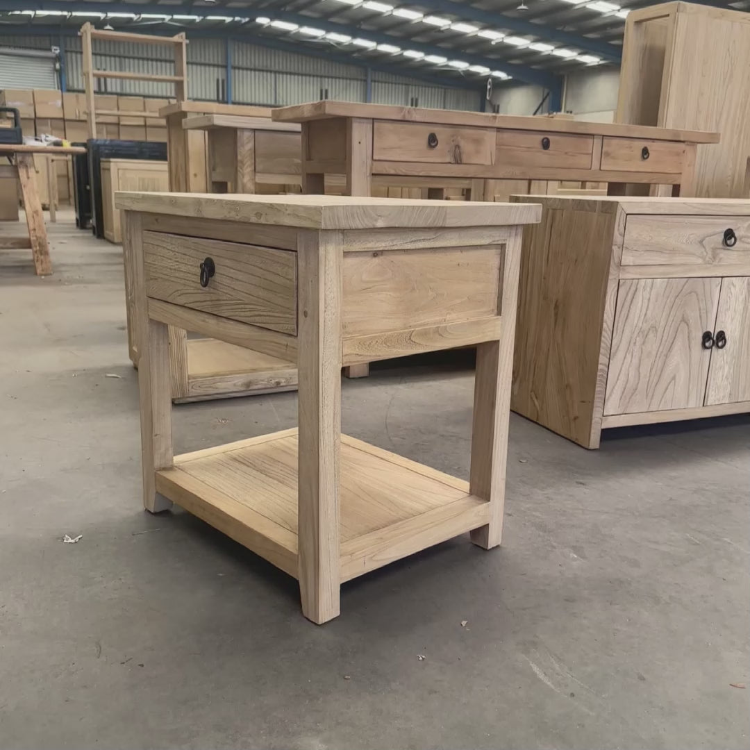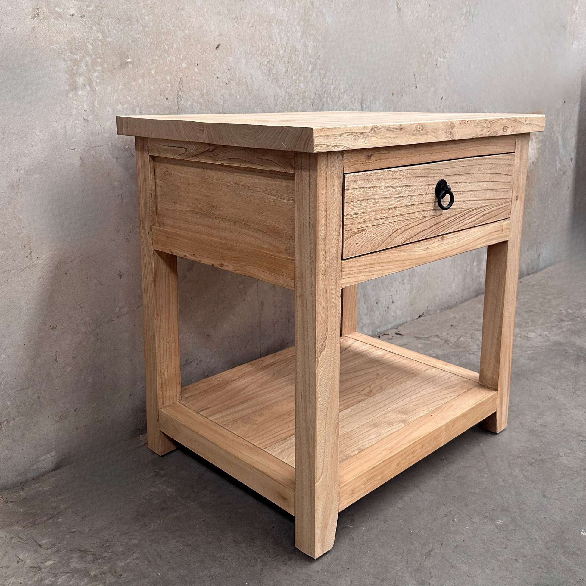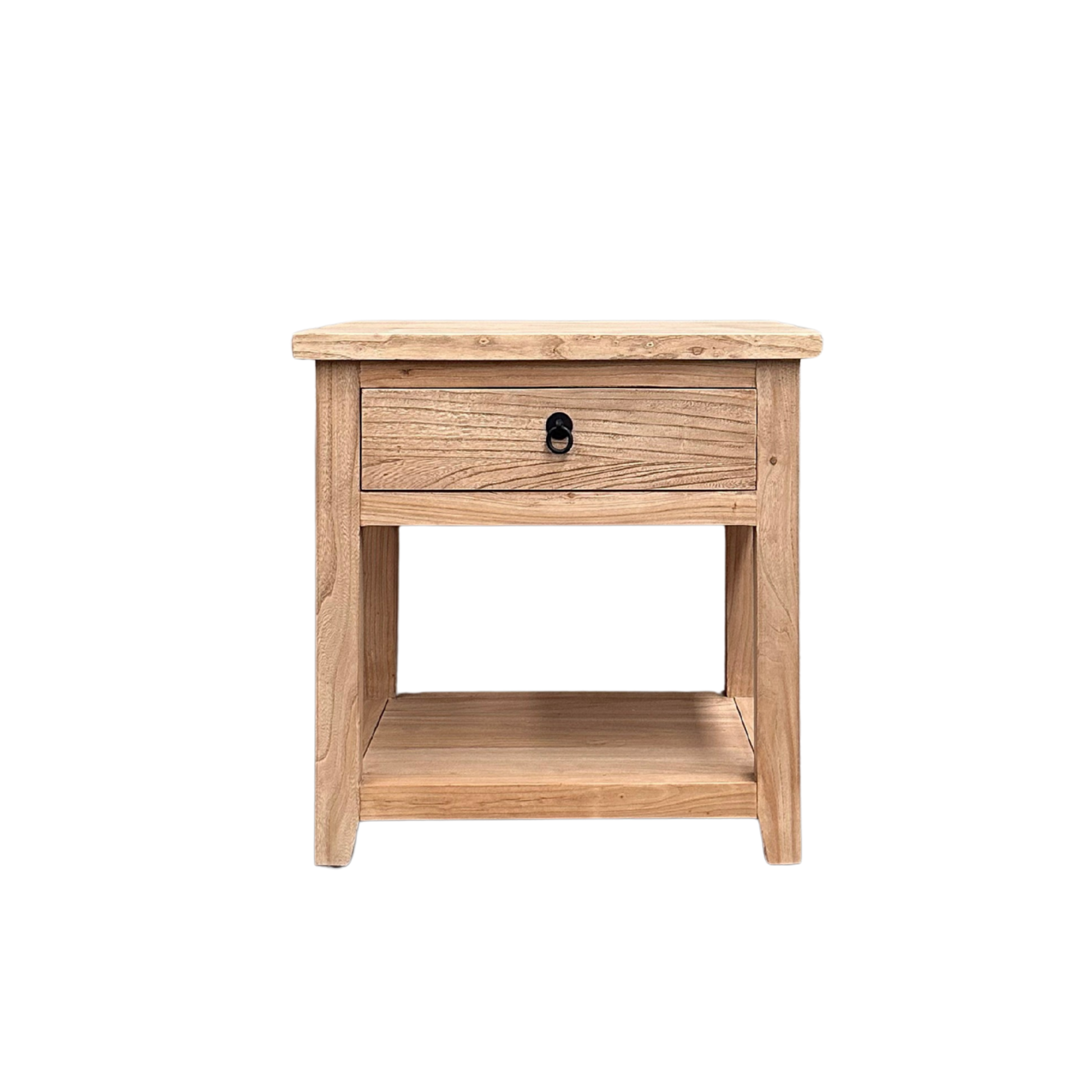 Made from natural, organic elm, each bedside displays unique knots, subtle colour shifts and surface variation inherent to aged timber. A single drawer provides discreet storage, while the open lower shelf offers accessible space for books or everyday essentials, making it well suited to bedrooms seeking functional storage with understated presence.