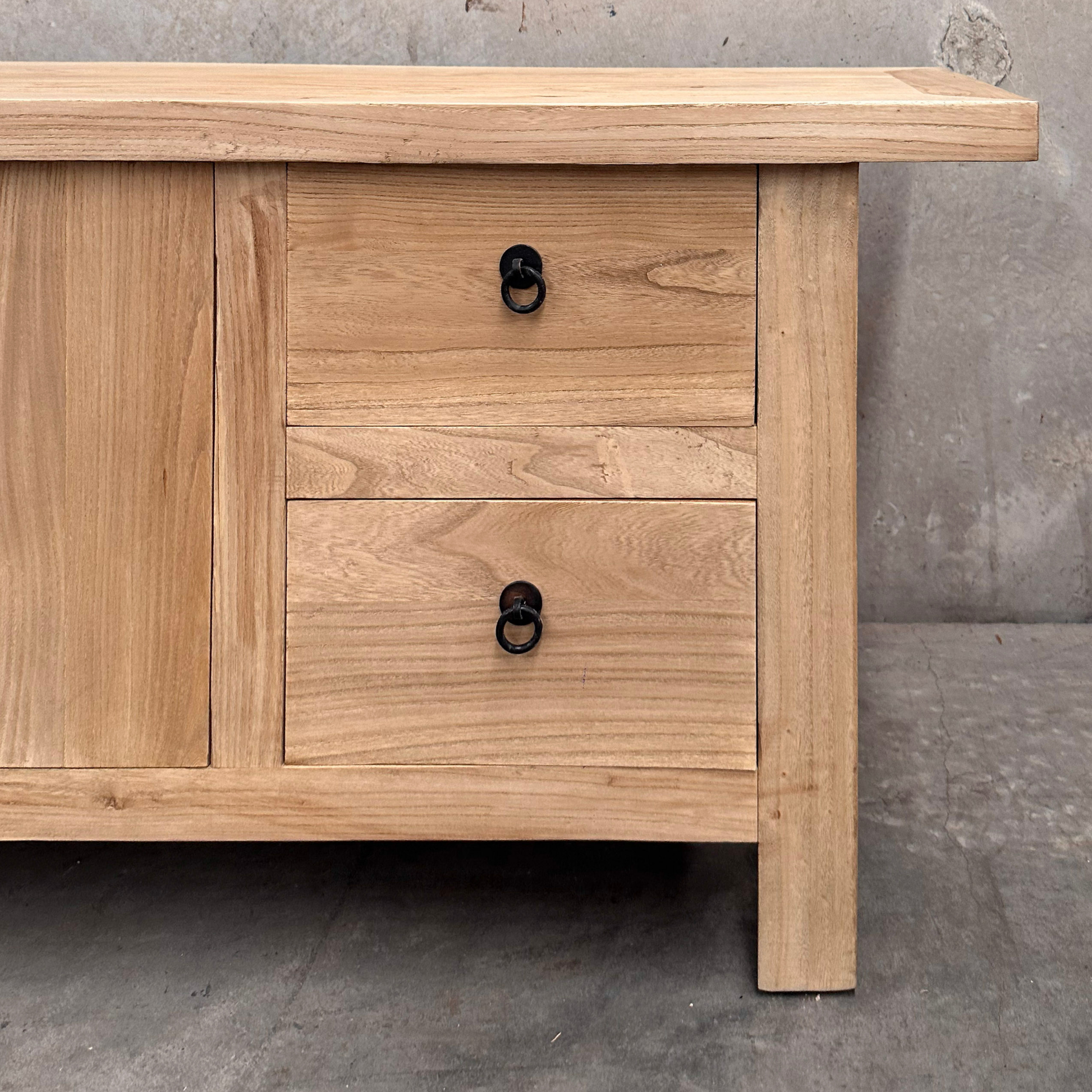 Made from natural, organic elm, each cabinet displays unique knots, subtle colour shifts and surface variation inherent to aged timber. The 180 cm width provides generous surface space for media displays, while the combination of drawers and central cupboard offers concealed storage suited to living rooms or open-plan interiors seeking practical cabinetry with material depth.