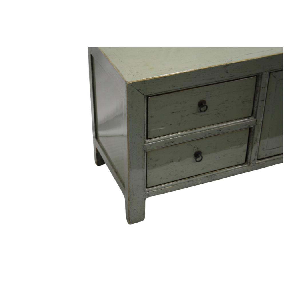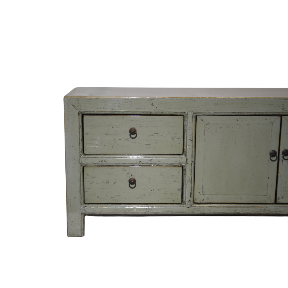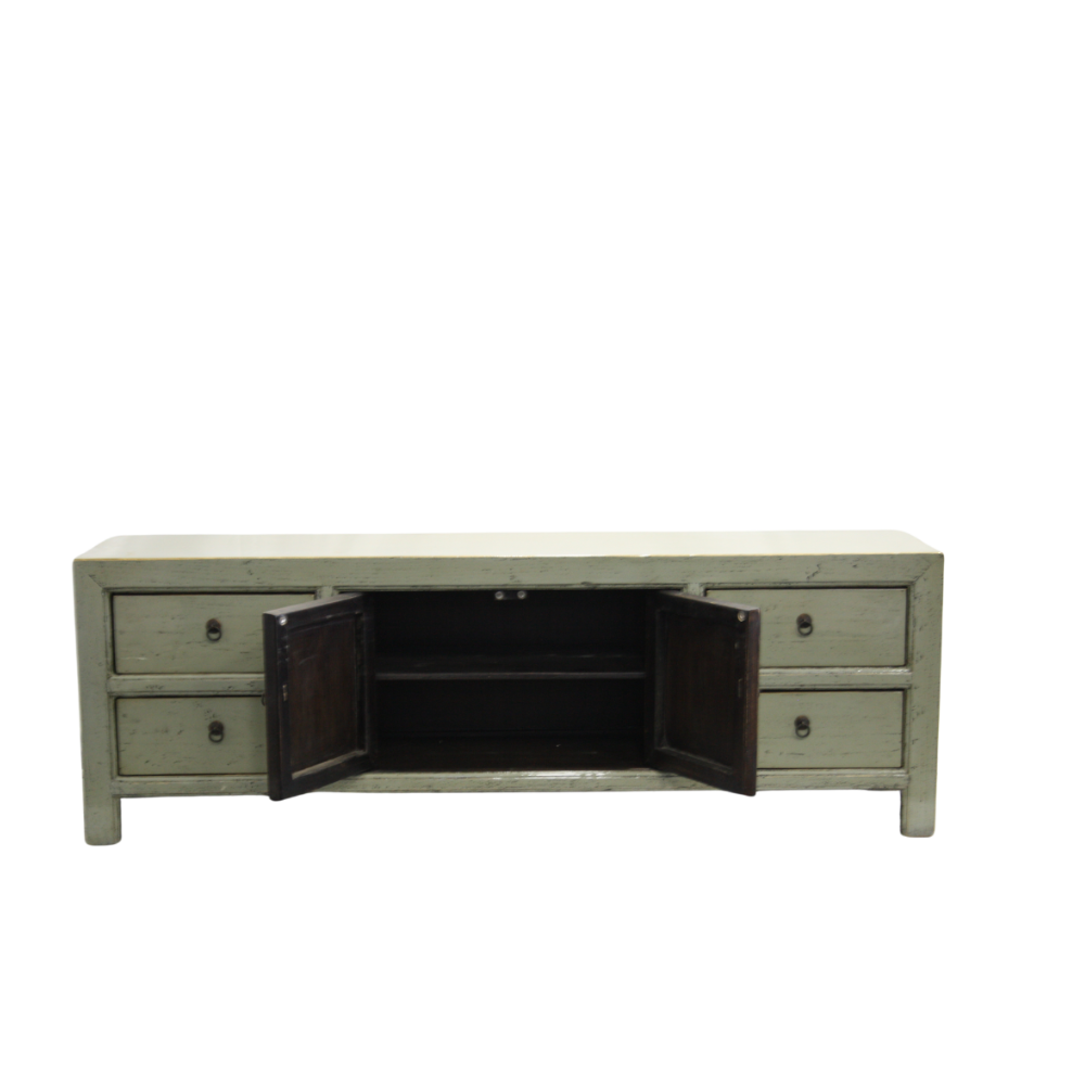 The Low Lacquered TV Cabinet in Sage blends soft colour, thoughtful storage, and sustainable craftsmanship. Made from recycled Chinese elm wood and finished in a sleek sage lacquer, it showcases natural timber grain beneath a polished, contemporary surface.