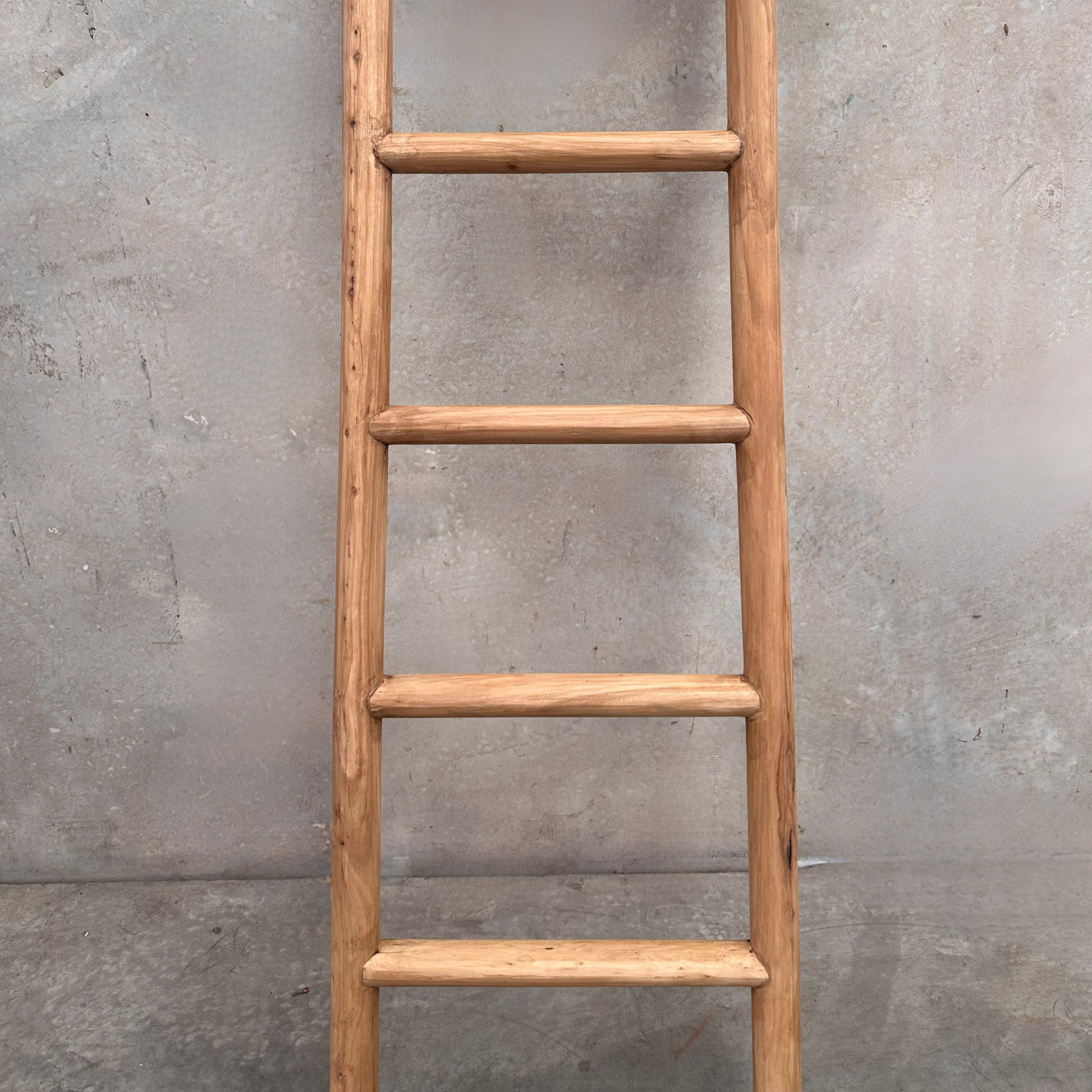 Made from natural elm, each ladder displays unique knots, colour shifts and surface texture inherent to organic timber. Designed to lean against a wall, it offers a versatile styling element suited to bedrooms, living spaces or bathrooms for hanging throws and towels, or as a sculptural feature within layered interiors.