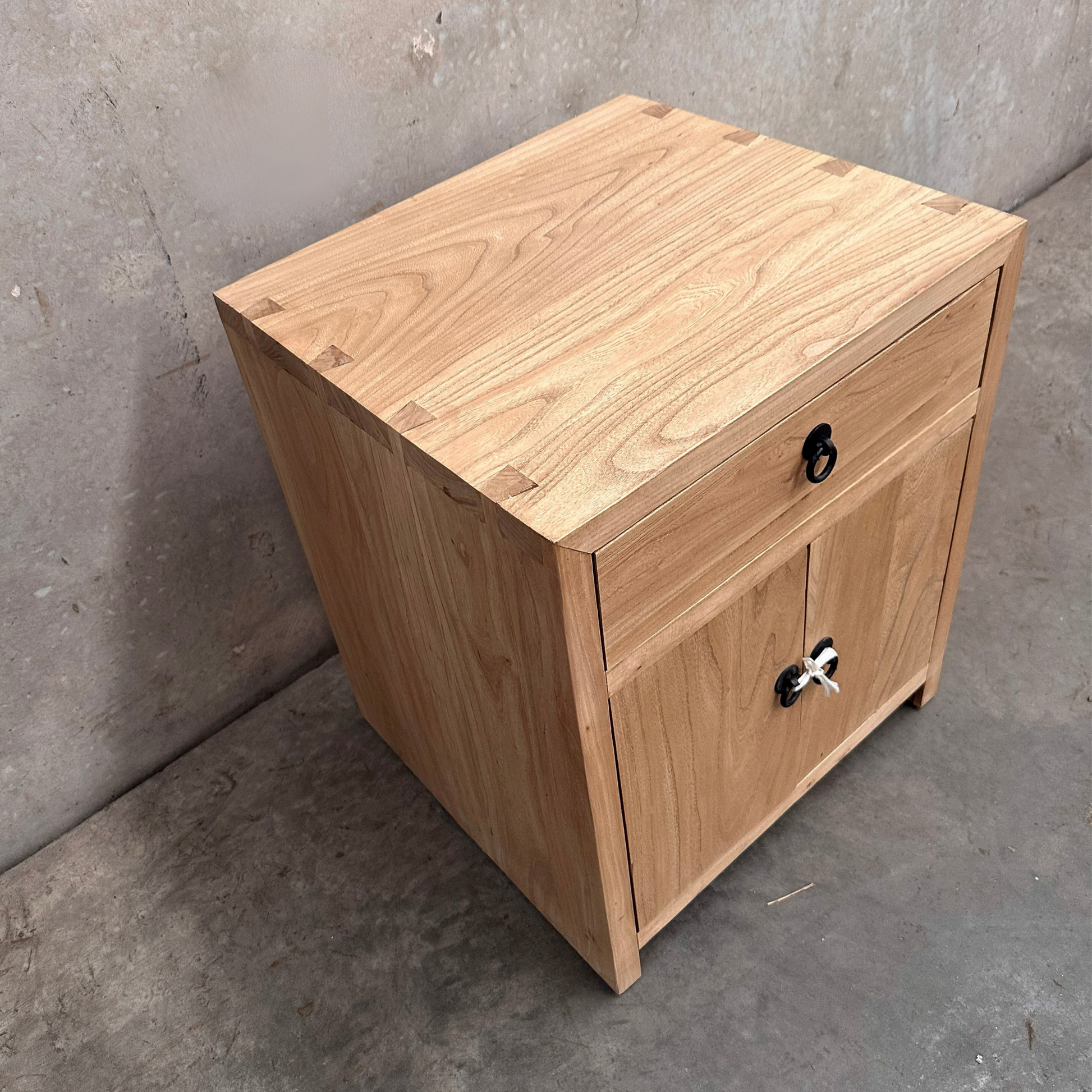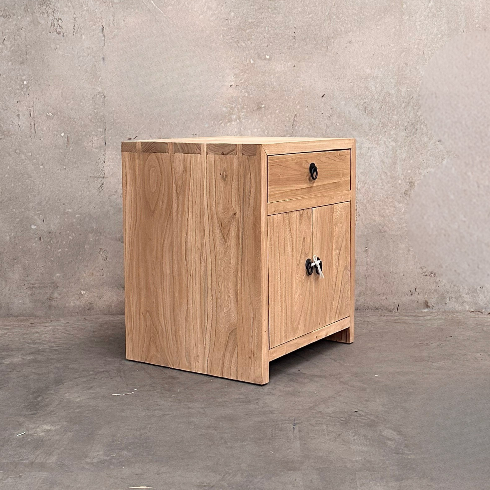 Made from natural, organic elm, each cabinet displays unique knots, subtle colour shifts and surface variation inherent to aged timber. A full-width drawer provides discreet storage, while the two-door compartment below offers concealed shelving, making it well suited to smaller bedrooms or interiors seeking durable timber storage without visual bulk.