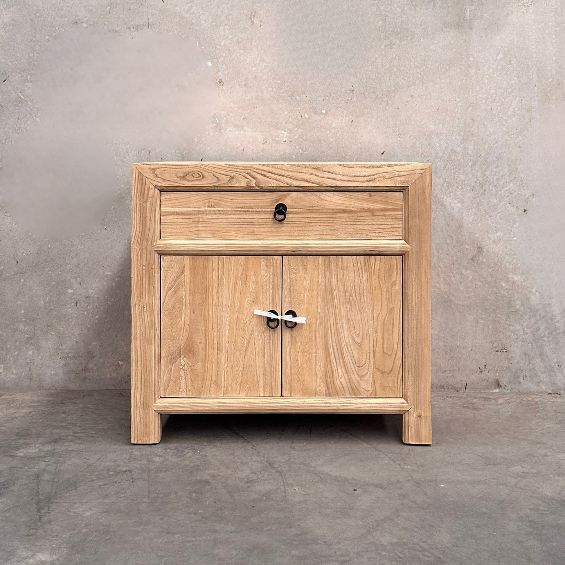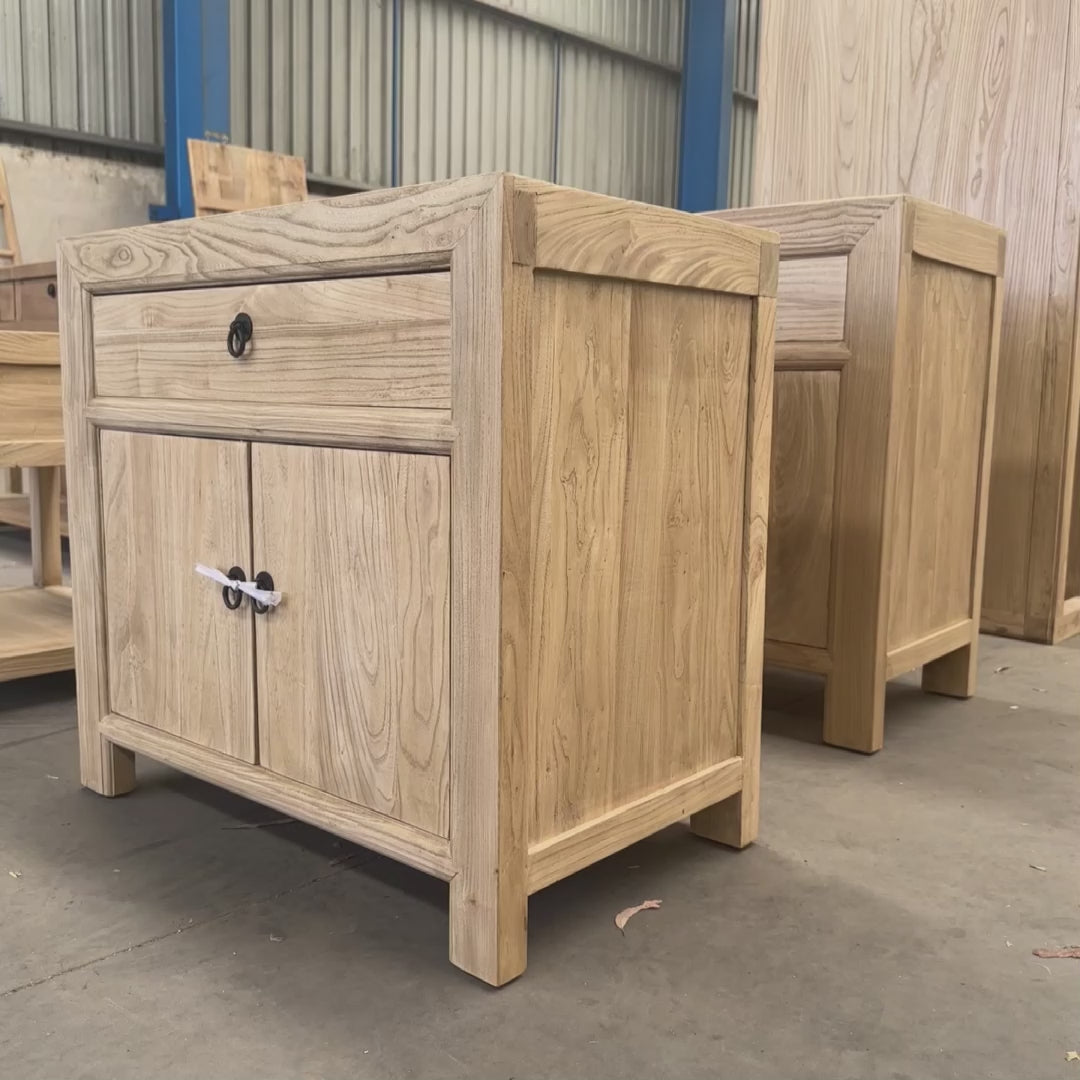 Made from natural, organic elm, each cabinet displays unique knots, subtle colour shifts and surface variation inherent to aged timber. The upper drawer provides discreet storage, while the two-door compartment below reveals a single internal shelf for practical organisation, making it well suited as a generous bedside, compact hallway cabinet or slimline media console.