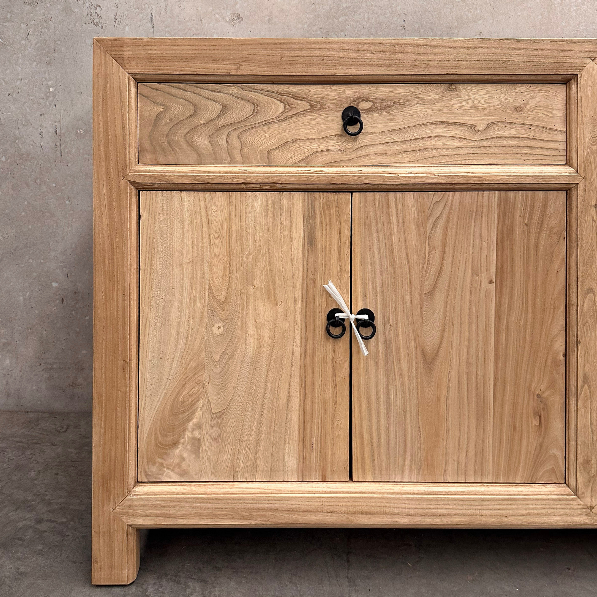 Made from natural, organic elm, each cabinet displays unique knots, subtle colour shifts and surface variation inherent to aged timber. Two upper drawers provide practical storage, while four doors below open to reveal adjustable internal shelving, making it well suited to dining rooms, living areas or interiors requiring versatile concealed storage.