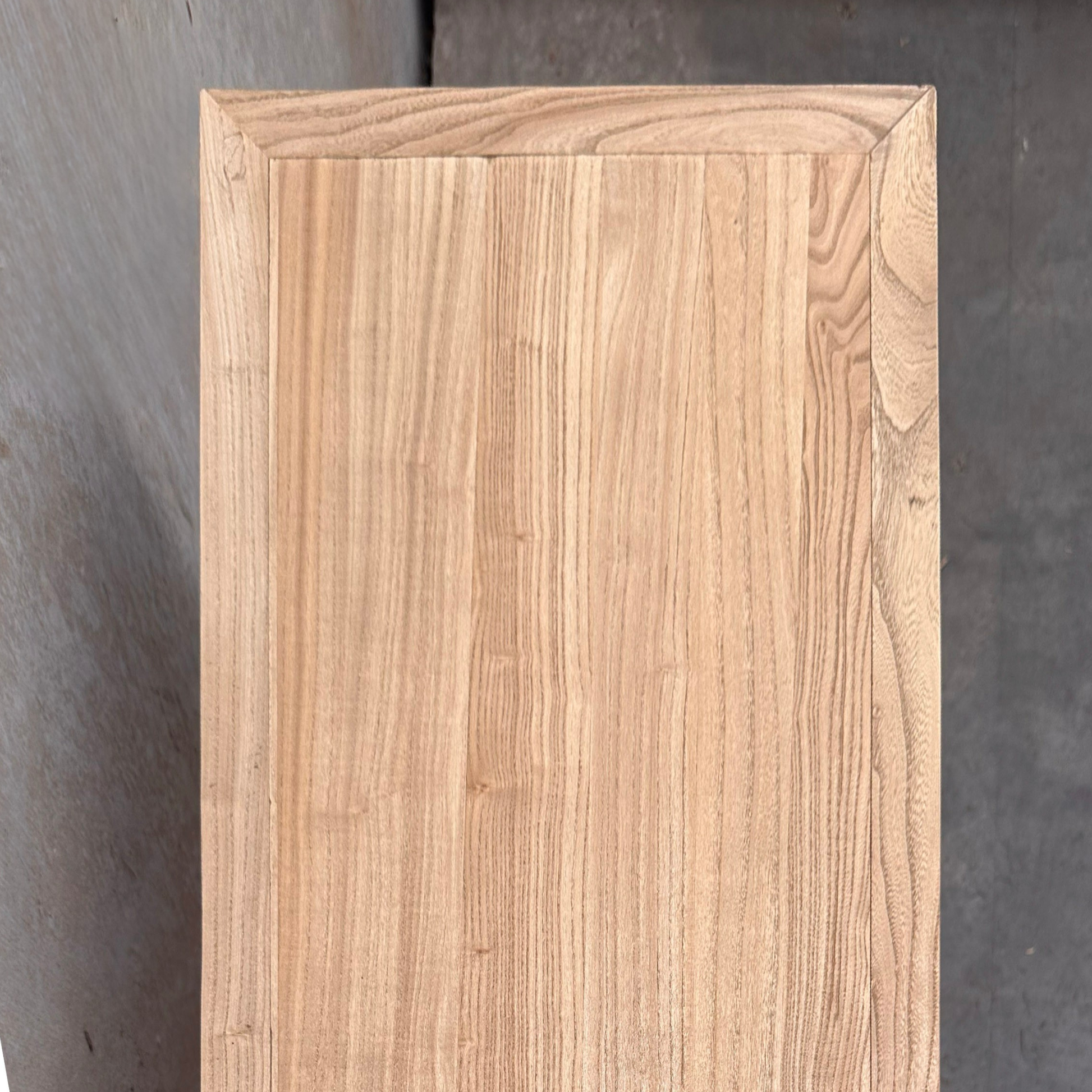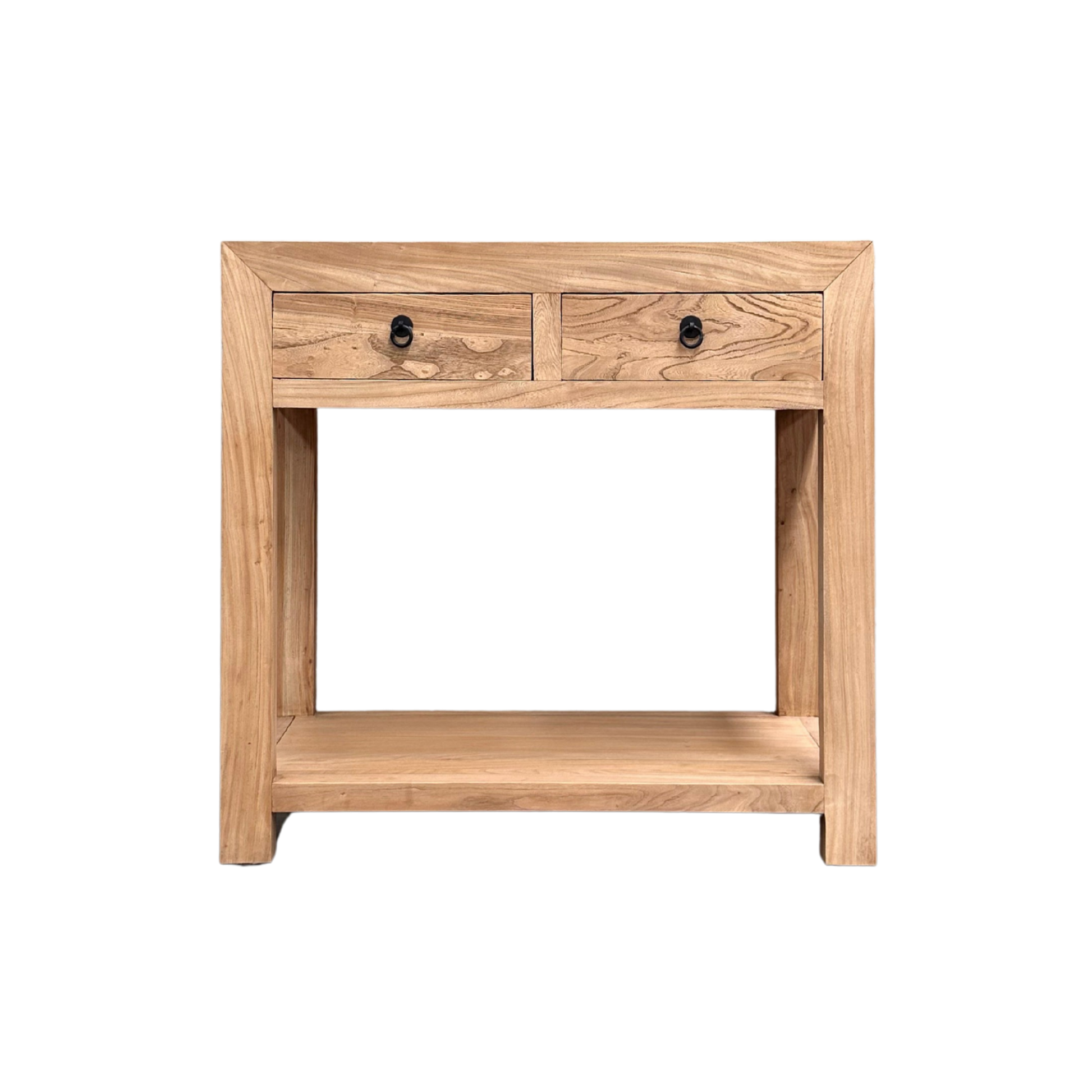 Crafted from solid elm, the Linear 2 Drawer Console is defined by its thick frame and clean, flush top profile. The structured silhouette highlights the natural grain movement and tonal variation of aged timber, giving the piece warmth while maintaining a restrained, architectural presence.