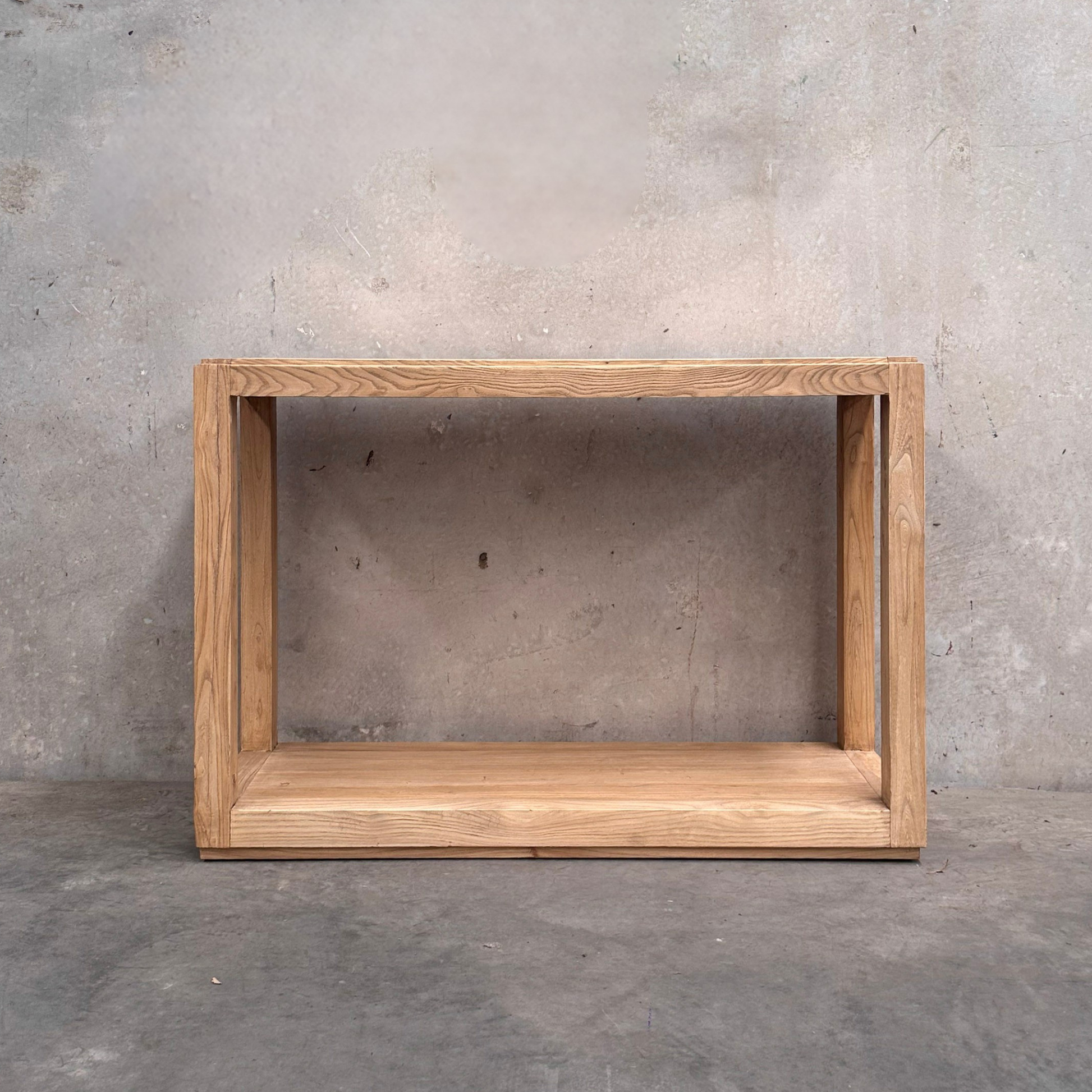 Made from natural, organic elm, each console displays unique knots, subtle colour shifts and surface variation inherent to aged timber. The open-frame design provides accessible storage or display space within a compact 120 cm width, making it well suited to entryways, living areas or retail environments seeking a balanced, minimal surface.