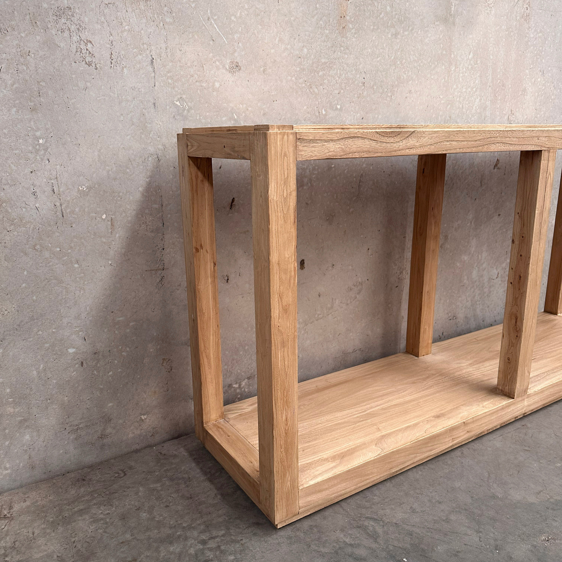 Made from natural, organic elm, each console displays unique knots, subtle colour shifts and surface variation inherent to aged timber. The 160 cm width offers generous surface space, while the twin open compartments provide accessible storage or display, making it well suited to living areas, entryways or layered interiors seeking minimal structure with material presence.