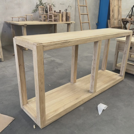 Crafted from solid elm, the Open Console is defined by its fully framed, rectangular form and flush top profile. The natural grain movement and tonal variation of the elm bring warmth and depth to the clean, architectural structure.